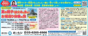 城郭ライター(日本城郭協会理事)で、「お城EXPO」などでも人気の講師、萩原さちこさんが2日間、松本城などを案内してくれるツアーが7月26~27日、開かれます。 夏休みなので、親子を想定していますが、大人だけの一般参加も大歓迎。現地集合なども可能です。萩原ファンのみなさん、夏の信州・甲州の名城を満喫しませんか。 https://maitabi.jp/tour_search.php?courseCd=F170&search=courseCd